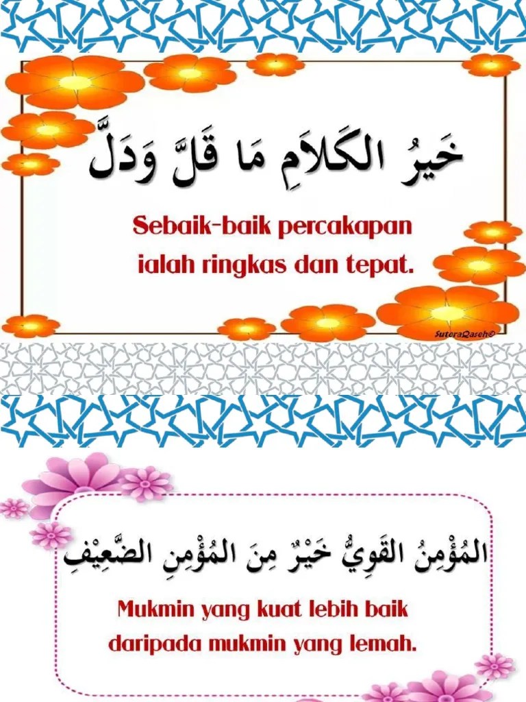 "`duduklah bersama keluarga dengan kelembutanmu."`. Barang siapa berjalan pada relnya, maka ia akan sampai. مَنْ سَارَ عَلَى الدَرْبِ وَصَلَ barang siapa berjalan pada relnya, m. 50 kata mutiara bahasa arab tentang kehidupan dan artinya +gambar · 1#. Man sar ealaa aldarb wasal. artinya: "konsentrasikan pikiranmu pada pelajaranmu!" ﺍِﺫَﺍ ﺻَﺪَﻕَ ﺍﻟْﻌَﺰْﻡُ ﻭَﺿَﺢَ ﺍﻟﺴَّﺒِﻴْﻞُ. Kehidupan ini juga tidak luput dari keterpurukan, namun melalui itu kamu bisa belajar memahami kehidupan yang sebenarnya. Kecintaan/ketulusan teman itu, akan tampak pada waktu kesempitan. Lan tarji'al ayyamul lati madhot.. مَا أَجْـمَلَ أَنْ تَبْتَسِمَ حِيْنَ يَظُنُّ الآخَرُوْنَ أَنَّكَ سَوْفَ . Likulli maqomin maqolun, wa likulli maqoolin . "`duduklah bersama pemimpin dengan ilmumu."`. "`duduklah bersama teman dengan adab/etikamu."`. "as shobru kaa as shobiri murrun fii madzaaqotihi. Wamaalladhat 'iilaa baed altaeab. artinya . Mahfudzat ini diambil dari al qur'an, hadits, atsar shahabat nabi dan nasehat serta irsyadat para ulama salaf dan kholaf.